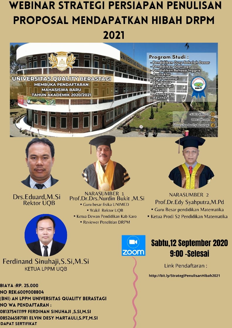 LPPM Universitas Quality Berastagi menyelenggarakan webinar dengan judul Kegiatan webinar strategi persiapan penulisan proposal mendapatkan hibah DRPM 2021. Banyak dana penelitian yang saat ini dis...