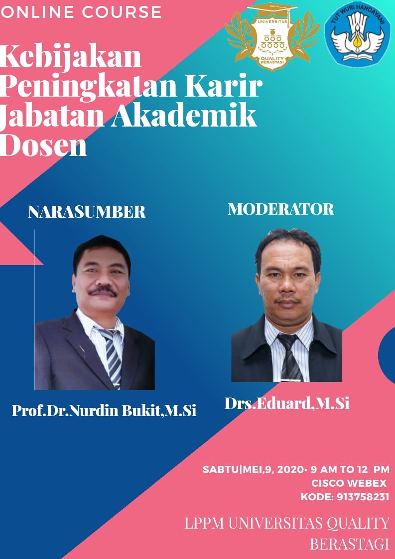 Seminar Online Kebijakan Peningkatan Karir Jabatan Akademik Dosen. Dalam rangka kelancaran pelaksanaan proses pengembangan karier kepada tenaga akademik/ dosen di lingkungan Universitas Quality Ber...